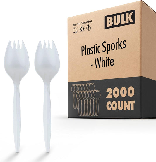 Stock Your Home 100 Disposable Sporks, White Plastic Sporks – Kid Safe 2 in 1 Utensils – Fork Spoon Perfect for School Lunch, Picnics, Catered Events, Restaurants and Kids Birthday Parties