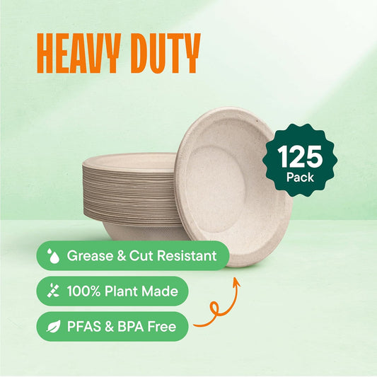 Stack Man Paper Bowls, 100% Compostable Disposable Soup Bowl [125-Pack] 12 oz. Heavy Duty, Eco-Friendly, Biodegradable Bagasse Hot Food Plates and Bowls - Natural Brown (BPI Certified) (PFAS-Free)