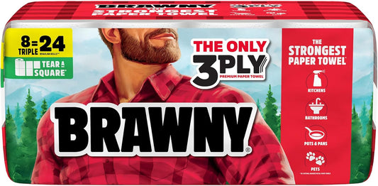 Brawny Tear-A-Square 3-Ply Paper Towels, 6 Double Rolls = 12 Regular Rolls, Strong, Absorbent, and Durable with 3 Sheet Sizes (Quarter, Half, Full)