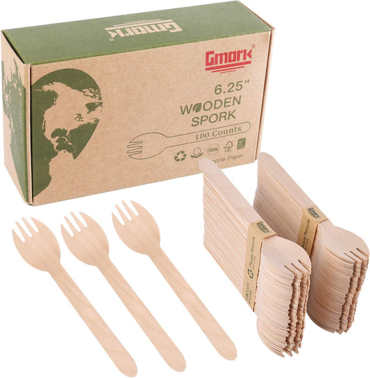 Gmark Eco-friendly Wooden Sporks 100 ct, Disposable Spoon Fork 2-in-1 Cutlery, 6.25" Birchwood Green Natural Product GM1033A